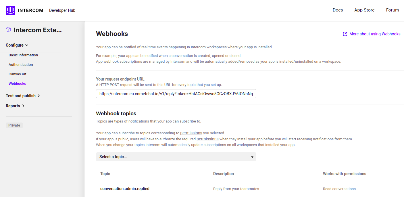 - Copy the above auto-generated Webhook URL and paste it in the Webhooks section on the Intercom Developer Hub.