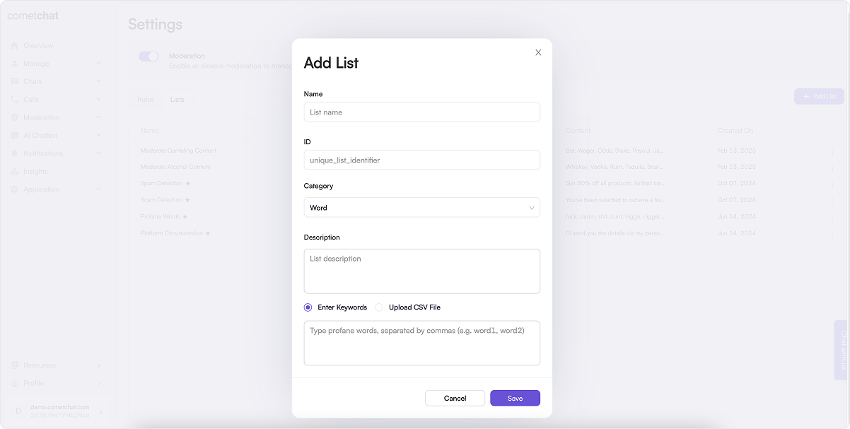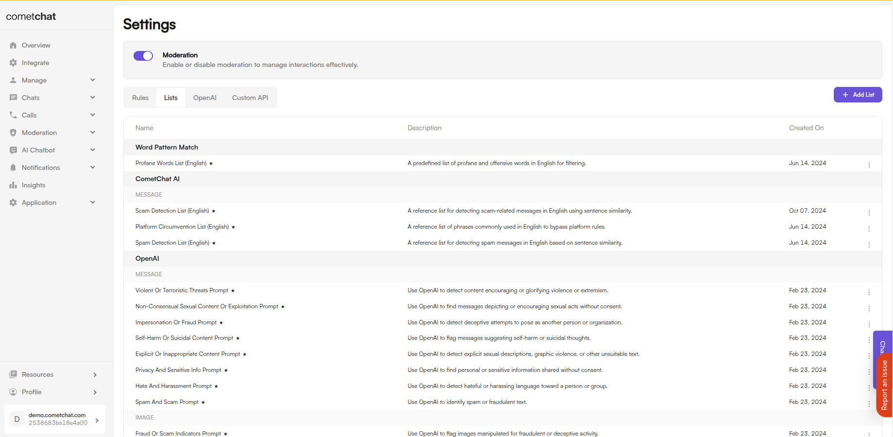 Login to CometChat Dashboard → Select your app → Moderation → Settings → Lists
