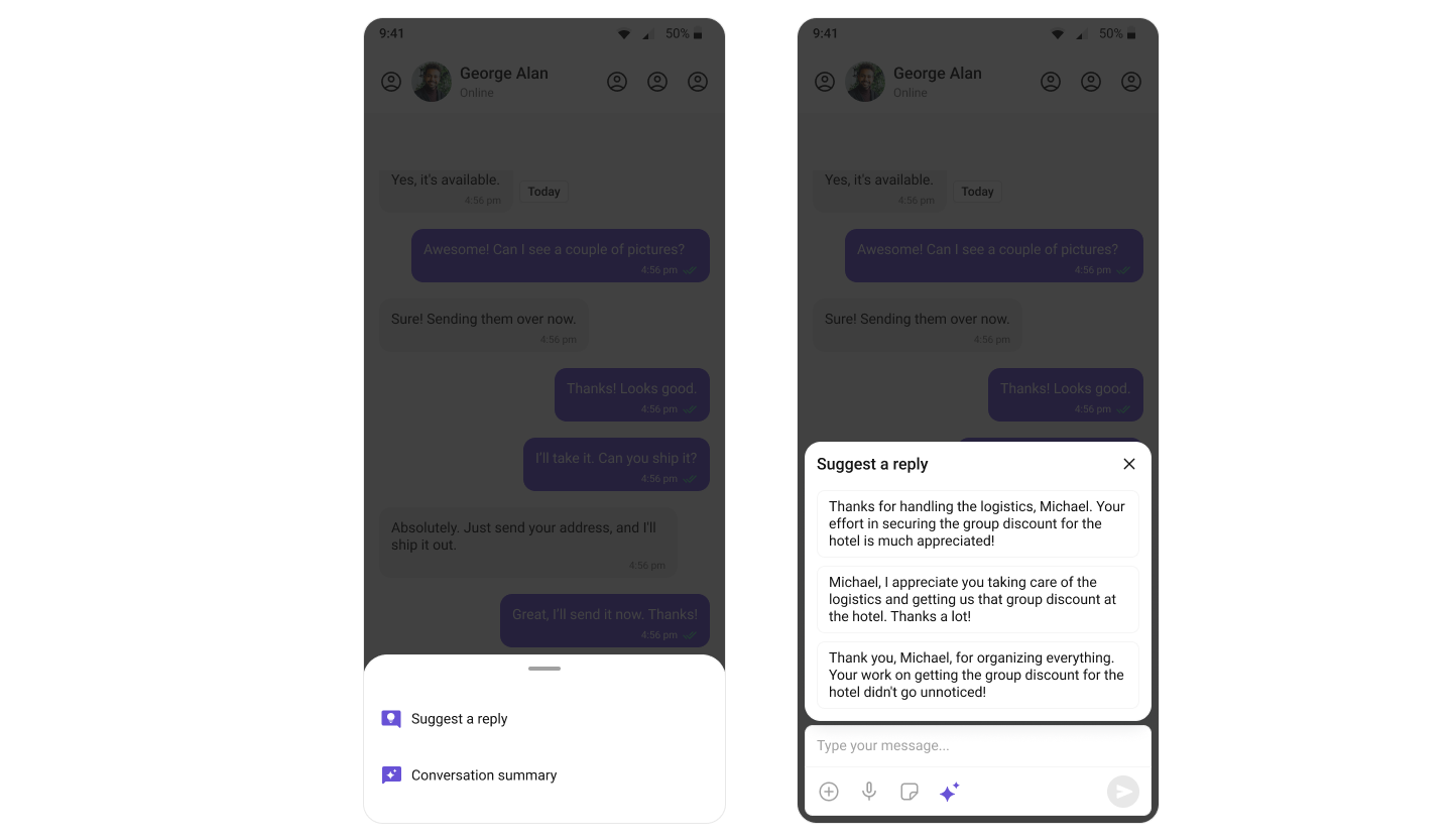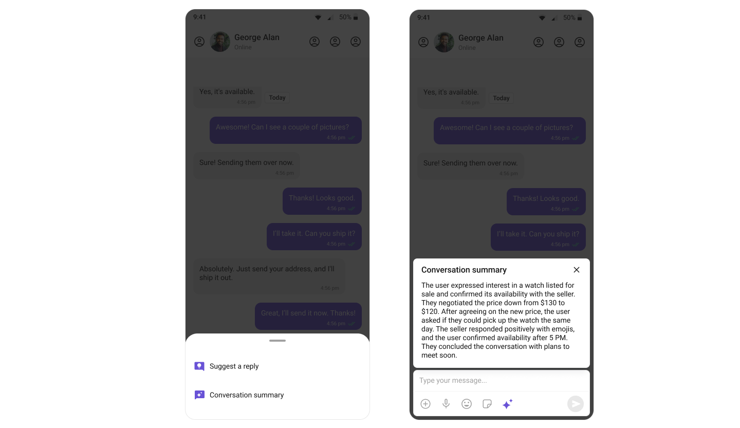 | AI features | Conversation Starter, Smart Replies, Conversation Summary |