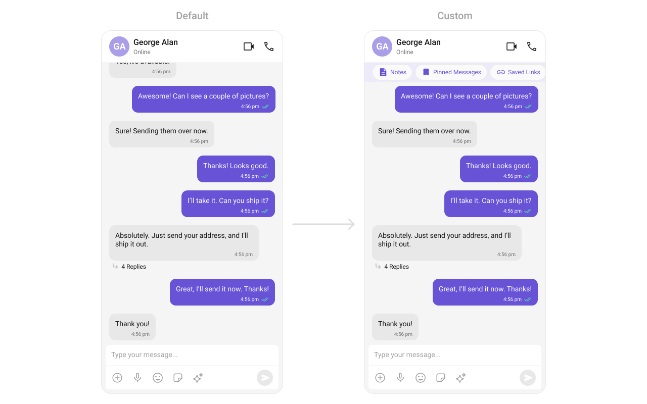 | Override behavior on user interaction | Activity/Fragment | setOn<Event> callbacks | setOnThreadRepliesClick((ctx, msg, tpl) -> { ... }) |