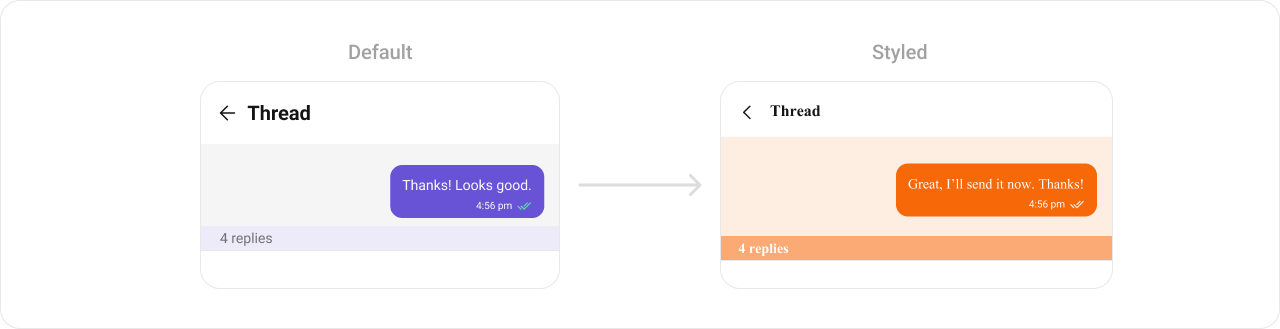 | Apply a custom style | Activity/Fragment | setStyle(int styleRes) | threadHeader.setStyle(R.style.CustomThreadHeaderStyle) |