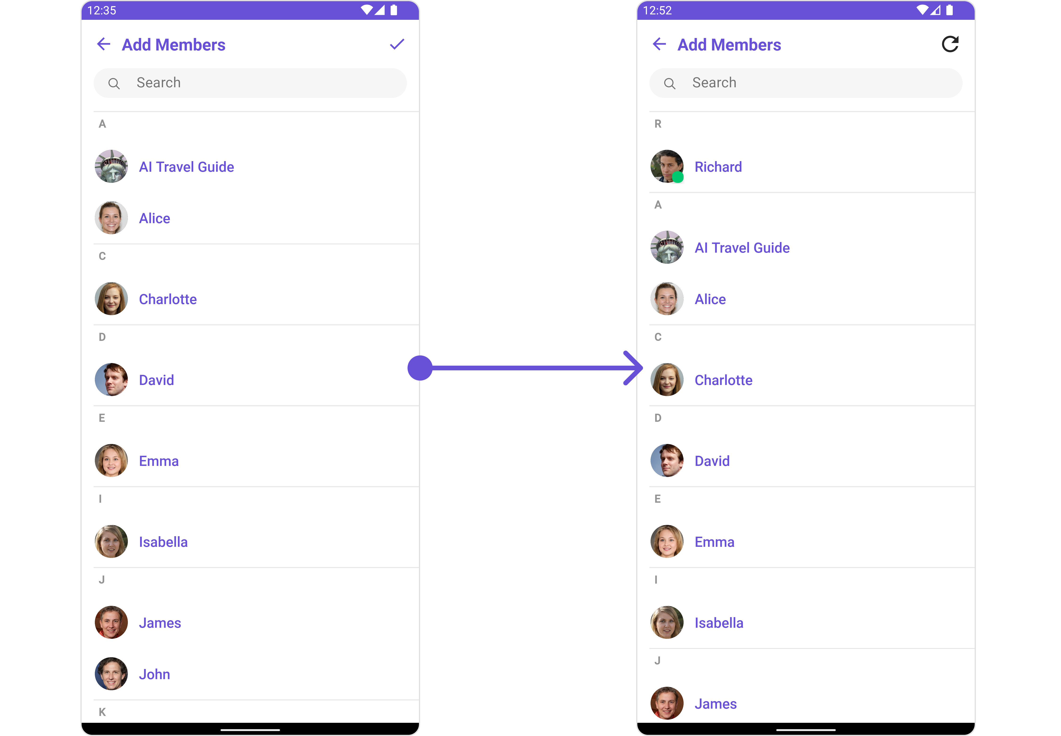| Property | Description | Code | | --------------------------- | ----------------------------------------------------------------------------------------------------------------------------------------------- | ------------------------------------------------ | --- | | Group | The group to which the users selected will be added. A required parameter. | .setGroup(Group) | | Title | Used to set title in the app bar | .setTitle(String) | | Style | Used to set styling properties | .setStyle(AddMembersStyle) | | Avatar Style | Used to customise the Avatar of the group member | .setAvatarStyle(AvatarStyle) | | Status Indicator Style | Used to customise the status indicator shown if a group member is online | .setStatusIndicatorStyle(StatusIndicatorStyle) | | Search Placeholder Text | Used to set search placeholder text | .setSearchPlaceholderText(String) | | Back Icon | Used to set back button icon | .backIcon(@DrawableRes int res) | | Show Back Button | Used to toggle visibility for back button | .showBackButton(boolean) | | Search Box Icon | Used to set search Icon in the search field | .setSearchBoxIcon(@DrawableRes int res) | | Hide Search | Used to toggle visibility for search box | .hideSearch(boolean) | | Hide Error | Used to hide error on fetching users and failing to add selected users to the group. | .hideError(boolean) | | Hide Separator | Used to hide the divider separating the user items | .hideSeparator(boolean) | | Hide Section Separator | Used to hide the text separating grouped user items | .hideSectionSeparator(boolean) | | Disable Users Presence | Used to control visibility of user indicator shown if user is online | .disableUsersPresence(boolean) | | Selection Icon | Used to override the default selection complete icon | .setSelectionIcon(@DrawableRes int res) | | Submit Icon | Used to override the default selection complete icon | .setSubmitIcon(@DrawableRes int res) | | Selection Mode | Used to set the number of users that can be selected. By default it is SelectionMode.multiple. SelectionMode can be single, multiple or none. | .setSelectionMode(SelectionMode) | |