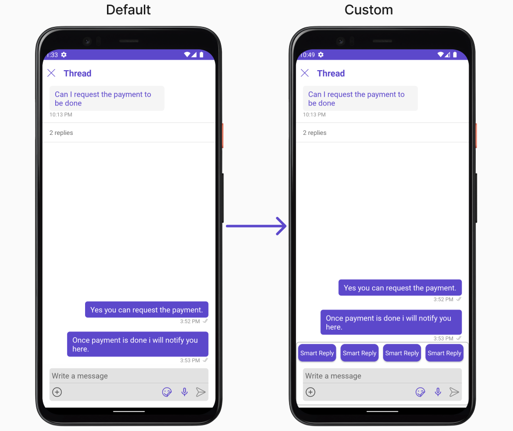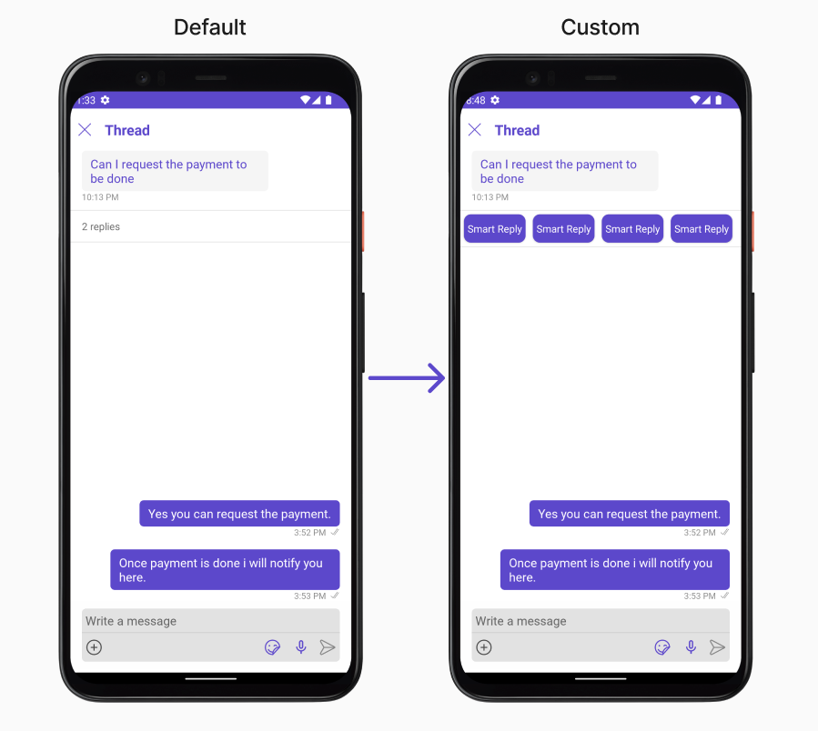 For advanced-level customization, you can set custom views to the component. This lets you tailor each aspect of the component to fit your exact needs and application aesthetics. You can create and define your views, layouts, and UI elements and then incorporate those into the component.MessageBubbleView