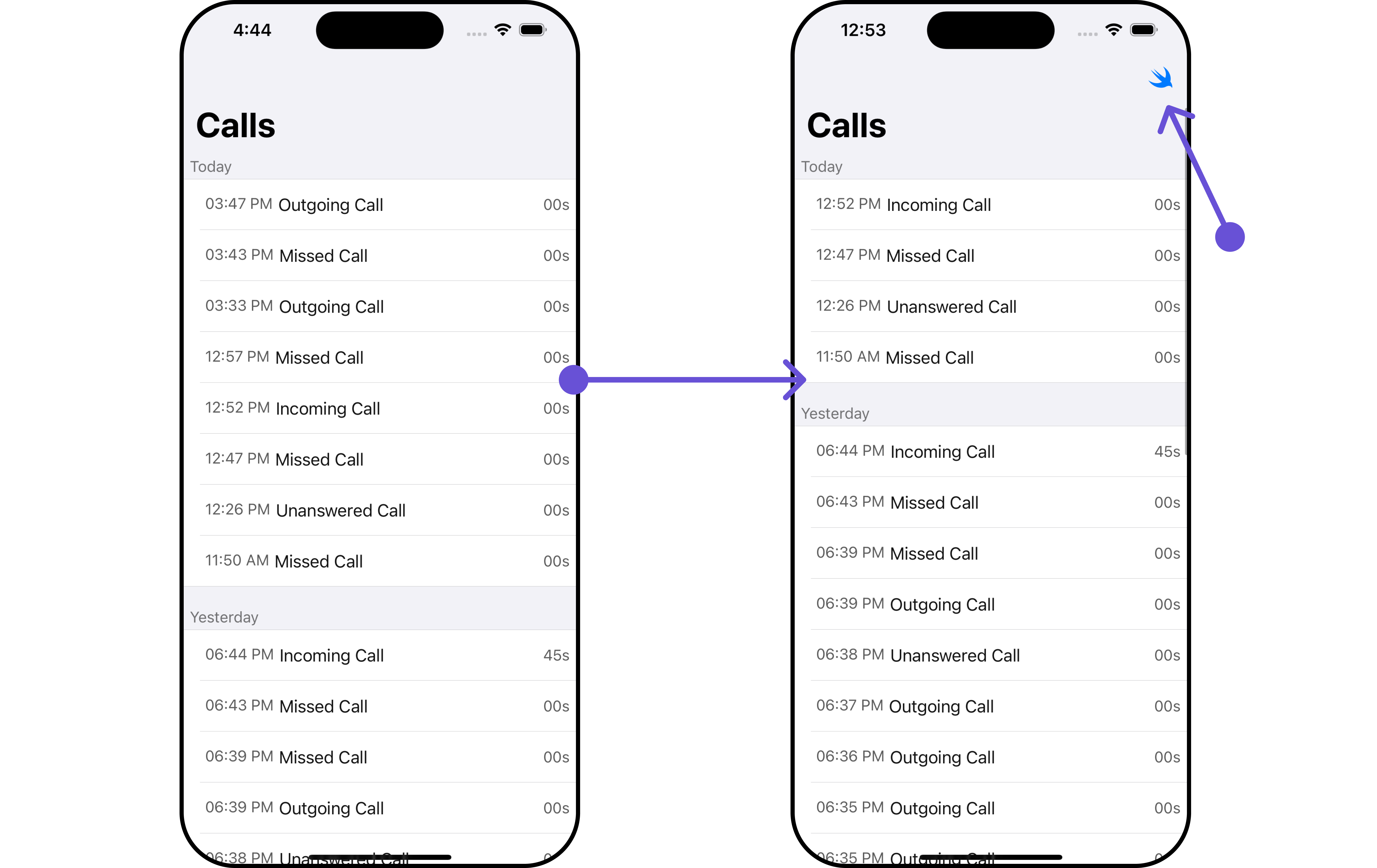 The callRequestBuilder enables you to filter and customize the call list based on available parameters in callRequestBuilder. This feature allows you to create more specific and targeted queries during the call. The following are the parameters available in callRequestBuilder Example In the example below, we are applying a filter based on limit , calltype and call status.- Swift