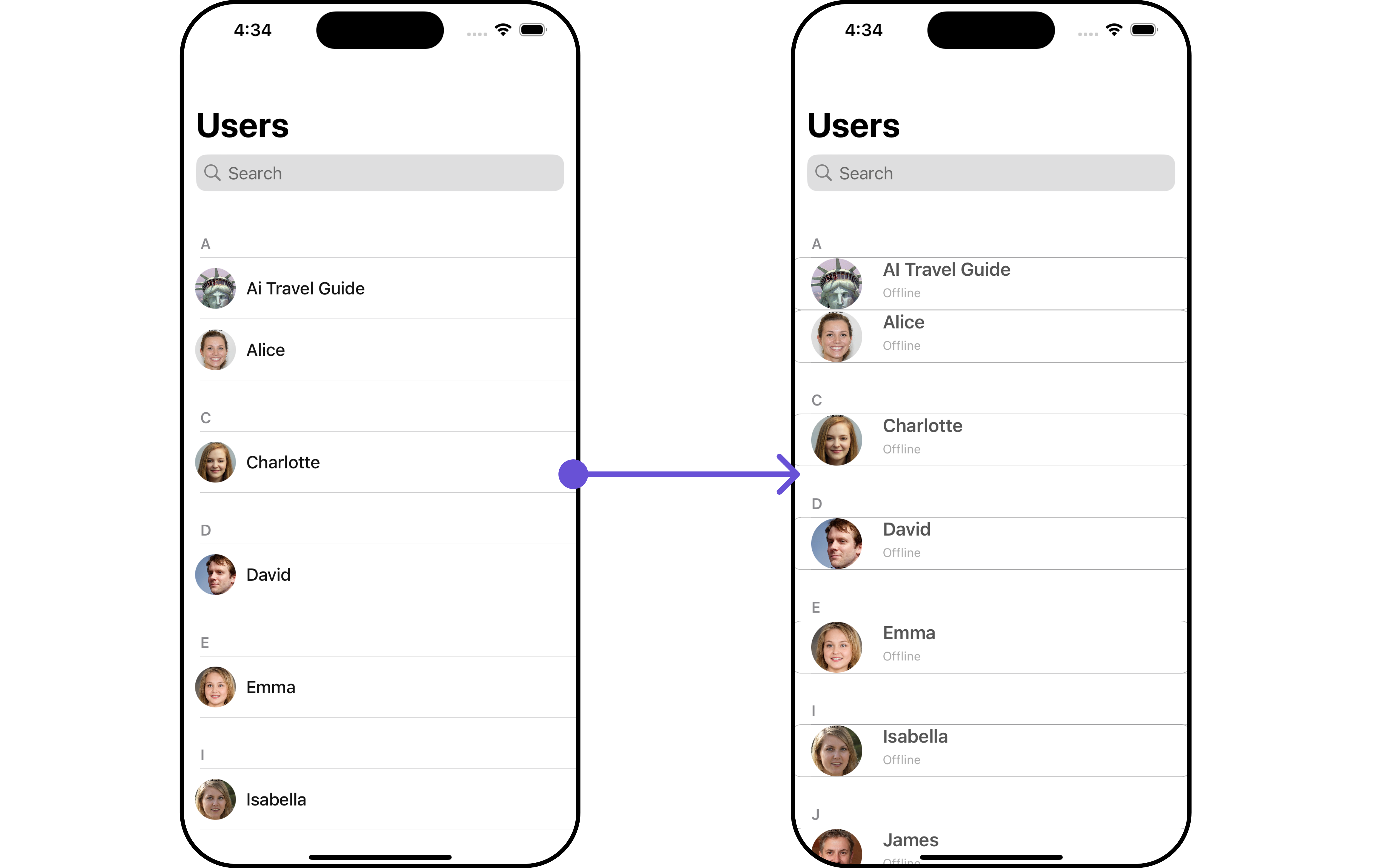 AsCometChatUsers is a custom view controller, it can be launched directly by user actions such as button clicks or other interactions. It’s also possible to integrate it into a tab view controller. CometChatUsers offers several parameters and methods for UI customization.