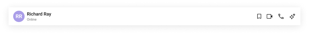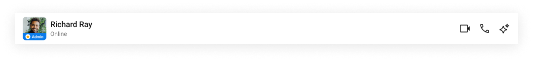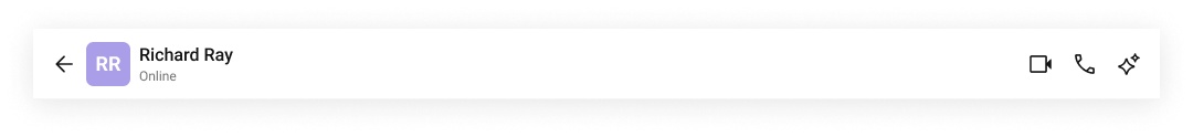 The component renders a toolbar with interactive elements. The back button, call buttons, and auxiliary buttons are keyboard-focusable and activate on Enter/Space. The avatar includes alt text. The typing indicator updates the subtitle text dynamically — screen readers announce the change via live region behavior.Props