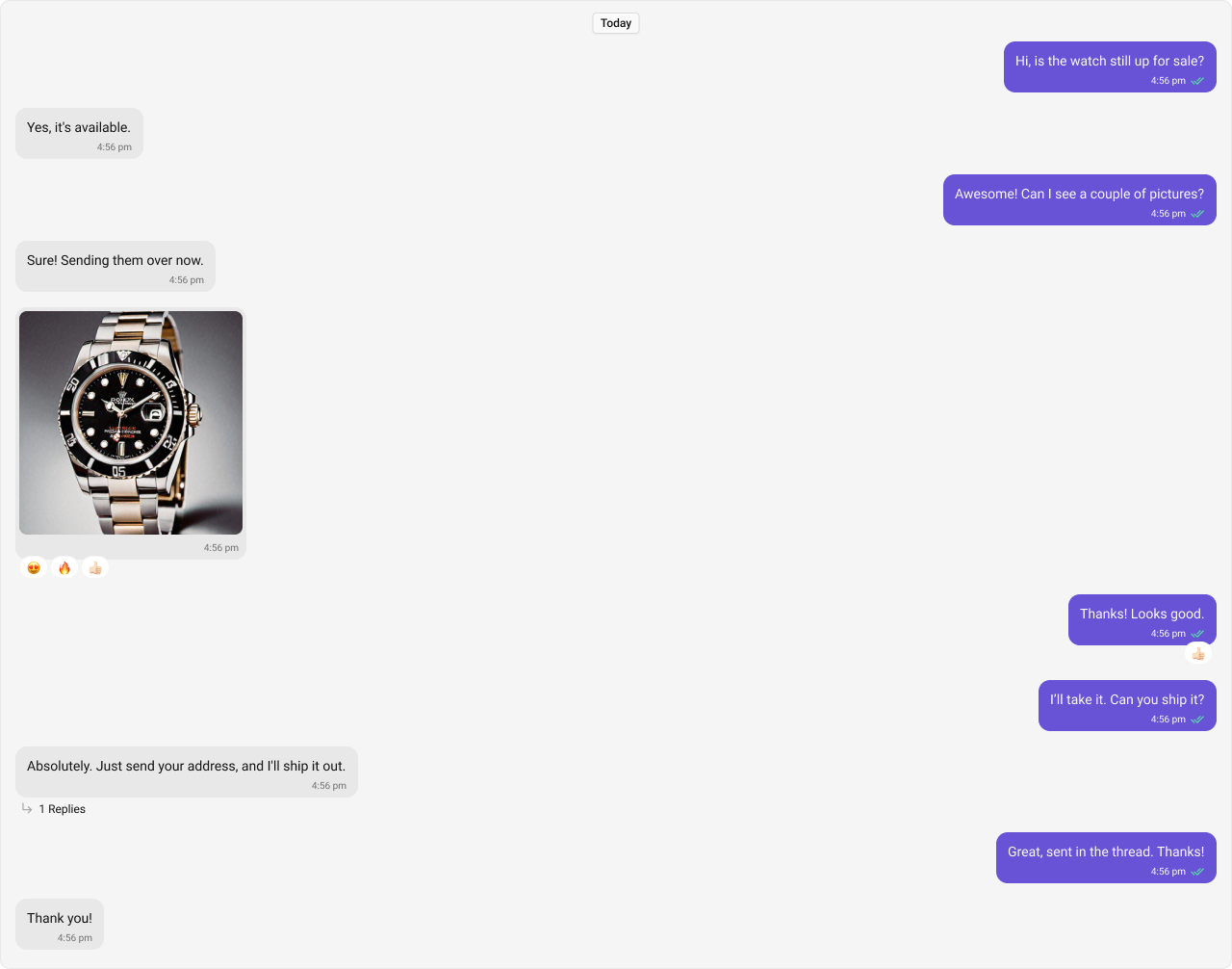 Message bubbles are rendered as semantic elements. Date separators provide temporal context. The list supports keyboard scrolling. Thread reply counts are interactive and keyboard-focusable. Reaction buttons activate on Enter/Space. Avatar images include the sender name as alt text.Props