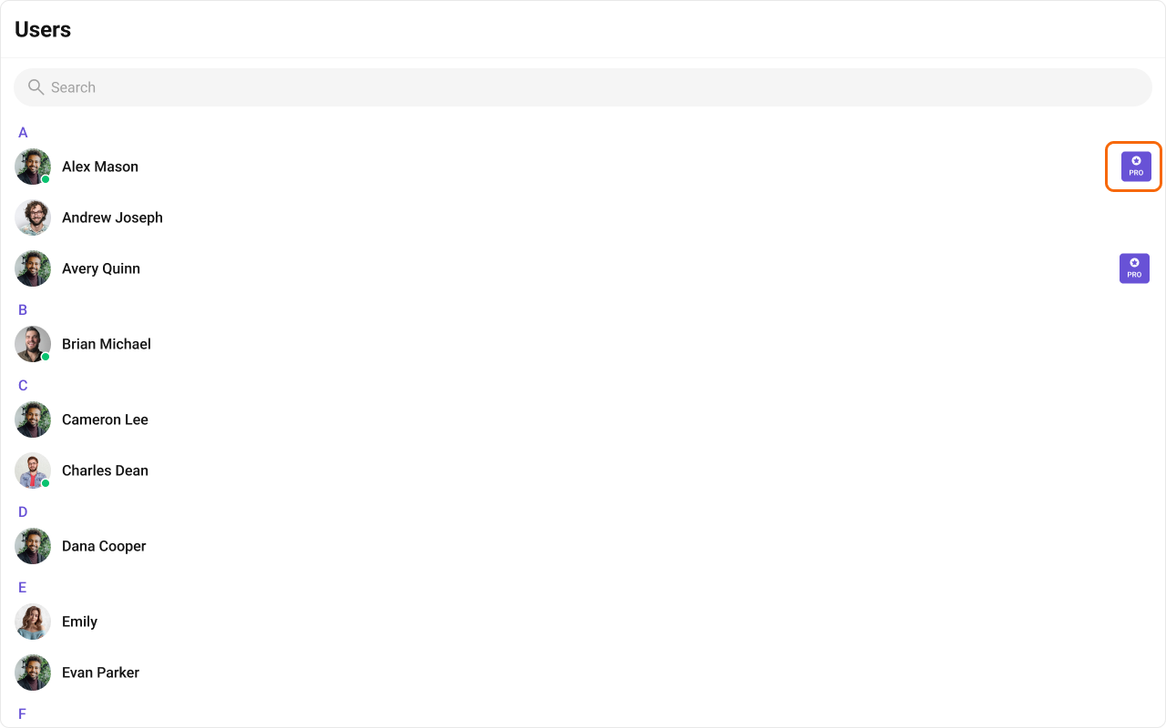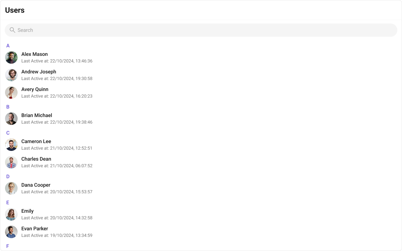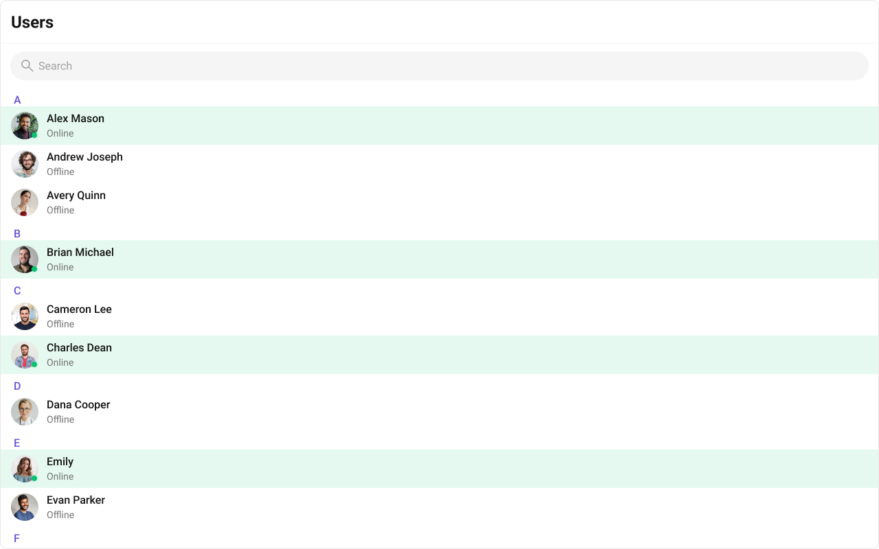 The component renders a scrollable list of interactive items. Each user row is keyboard-focusable and activates on Enter/Space. The context menu (options) is accessible via keyboard. Avatar images include the user name as alt text. Section headers (A, B, C…) provide visual grouping for alphabetical navigation. For screen readers, the user list is rendered as a semantic list. Status indicators (online/offline) use CSS mask images — addaria-label attributes via itemView if screen reader descriptions are needed for these visual indicators.